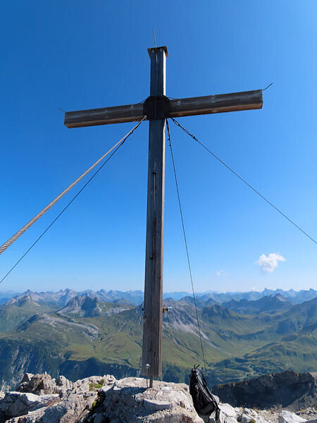 Elbert und Manfred sorgten mit ihren Instrumenten für eine tolle Stimmung. Von der Terrasse aus hatten wir die Wildgrubenspitze mit 2.753 m direkt vor uns und konnten auch das majestätische Gipfelkreuz bestaunen. Dieses Kreuz wurde vor 50 Jahren auf den Schultern einiger Männer zum Gipfel getragen und ist Symbol für die Verbundenheit mit der Natur und dem Glauben. Die anwesenden Träger berichteten von der Organisation und der Mühe dieser gefährlichen und schweißtreibenden Aktion. Durch diese Feier mit den Anwesenden wurde dies besonders gewürdigt und unterstrich die Bedeutung dieses Kreuzes für die Gemeinschaft.