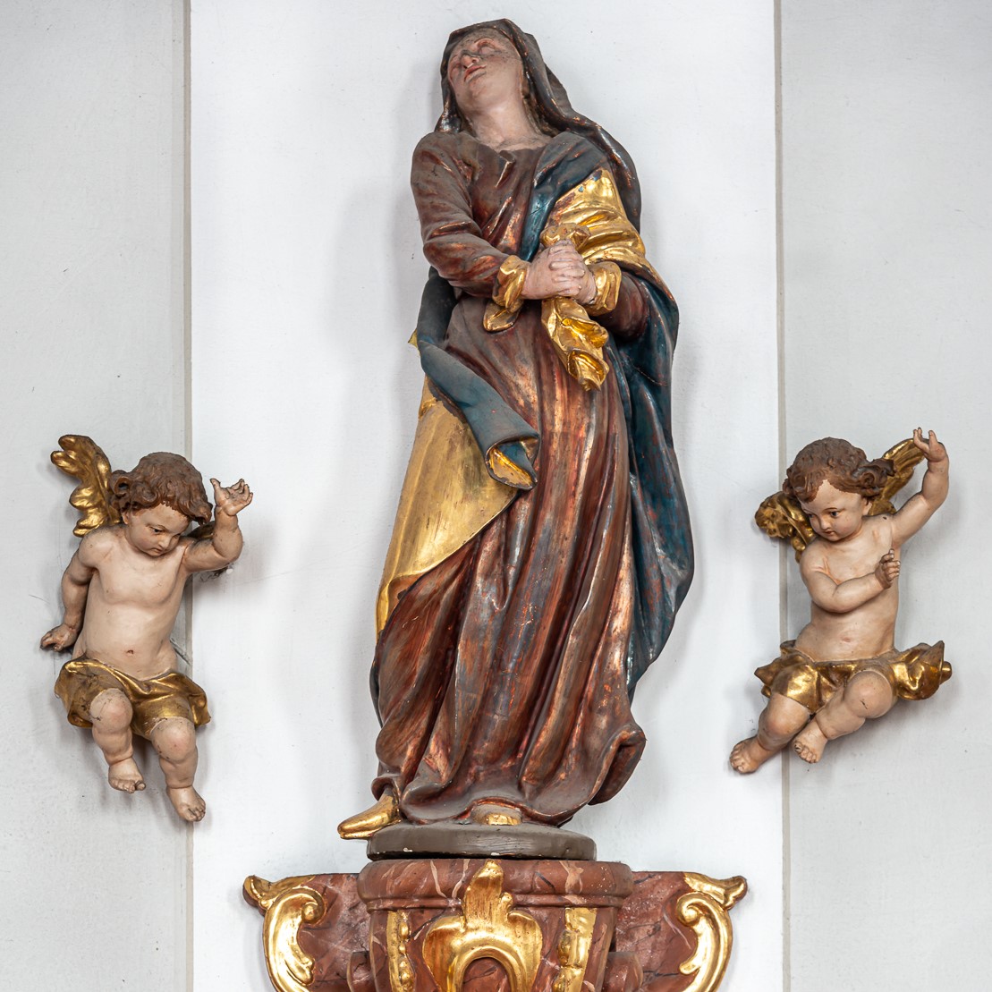 An der linken Seite des Langhauses steht eine „Mater Dolorosa“, die schmerzhafte Gottesmutter, die von zwei Engeln unterstützt wird. Es ist eine sehr eindrückliche Darstellung, wie Maria der tiefe Schmerz über das Leid und den Tod ihres Sohnes quasi fast wahnsinnig macht.