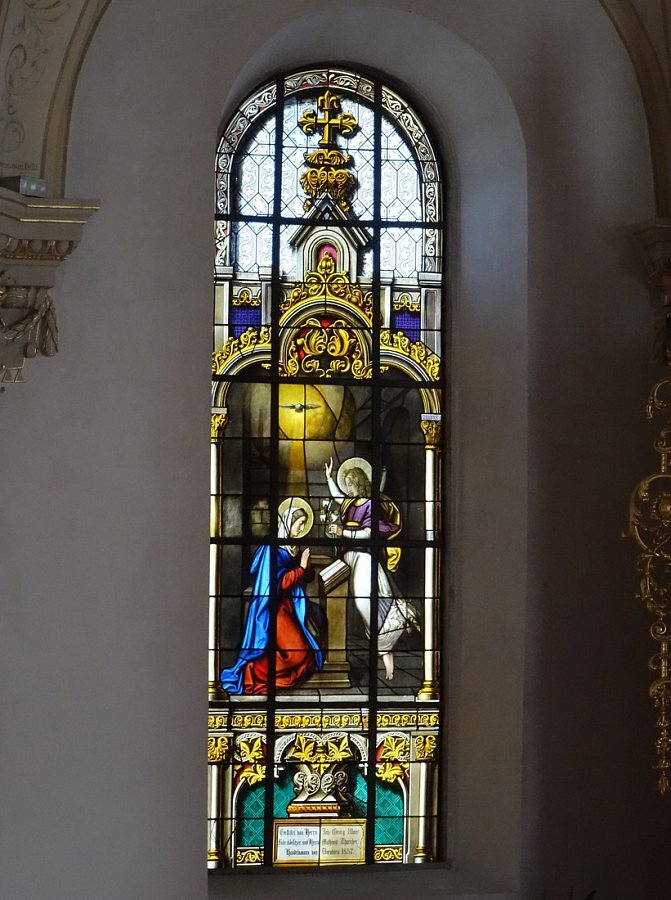 Glasmalereien im Chor 1857 von Ludwig Mittermeier, Lauingen an der Donau: li. Verkündigung an Maria, re. Heimsuchung Mariä