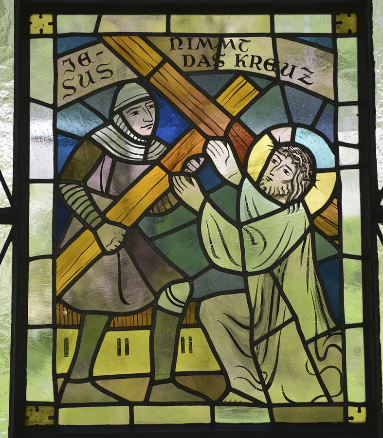 Bings Kirche Heiligste Dreifaltigkeit Kreuzweg Fenster Entwurf Hubert Fritz, Ausführung B. Dallaserra 1954